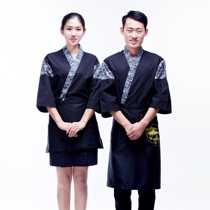 Mẫu áo bếp Nhật được thiết kế cách điệu từ kiểu áo Kimono truyền thống với cổ V, tay lỡ, vạt đắp chéo buộc dây ở hông.